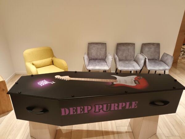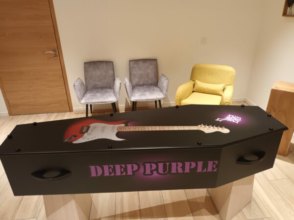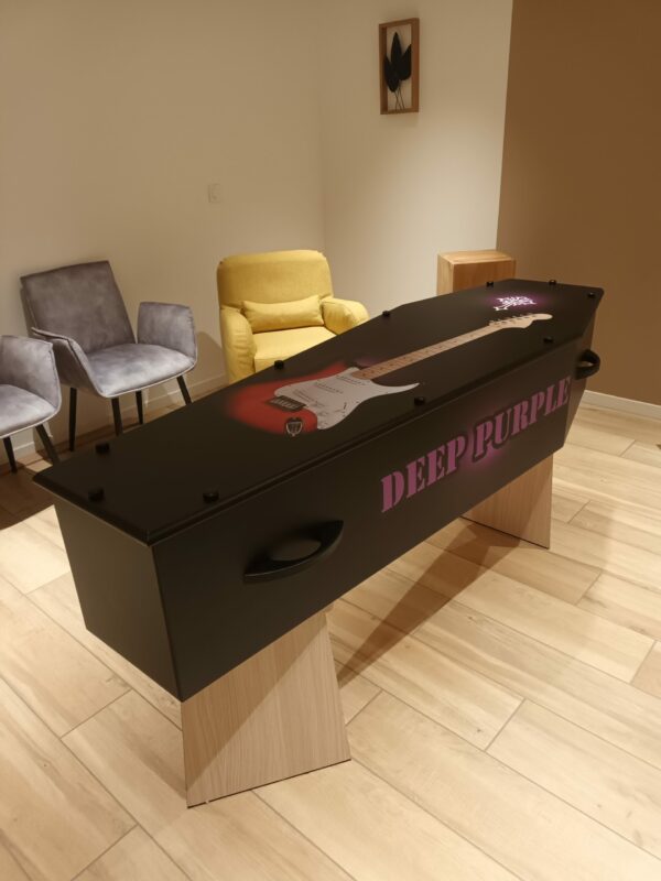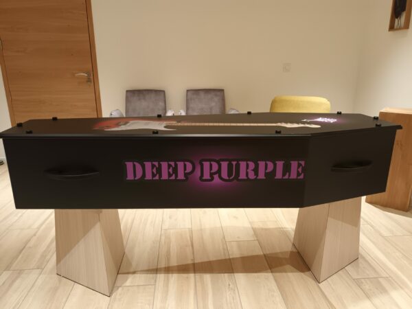 - Cercueil décoré avec motif « guitare » et inscription « Deep Purple »